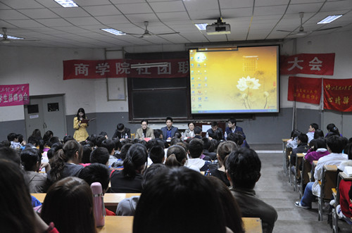 大会在校歌《你伴随我》中拉开序幕。董梅老师首先宣读了第二届商学院社团联合会理事会名单。接下来,由学院第一届社团联合会主席李明及校社团联合会理事长李景伟分别作简要发言。同时第二届社团联合会主席姜国栋对接下来的工作作了部署,他回顾了社团联合会的发展历程,同时对社团联合会的成员提出了新的目标和要求。
