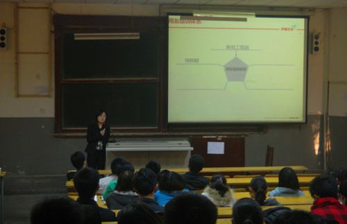 宣讲会伊始,邹世能就用友公司主打ERP软件的客户物质效益、软件应用范围、软件先进技术发展等方面向同学们介绍了公司良好的软件发展前景,然后邹总以“一切源自梦想”的企业文化为引导着重介绍了企业的发展历程和企业成就,向大家展示了公司目前所占的市场份额和庞大的客户群体,以及由此所产生的巨大社会效益,最后邹世能向在座的毕业生发出热情邀请。接着,王娜就“用友公司能给予你什么”为主题展开宣讲。她建议大家毕业后要选择一家成功企业来发展自己,并以此为切入点向同学们详细介绍了用友公司的培训体系、薪酬构成、招聘职位以及考核流程,从而展示出用友软件园良好的工作环境和员工丰富多彩的生活。宣讲会最后,部分毕业生向用友公司递交了个人简历,并就自身问题与主讲者进行了交流讨论。