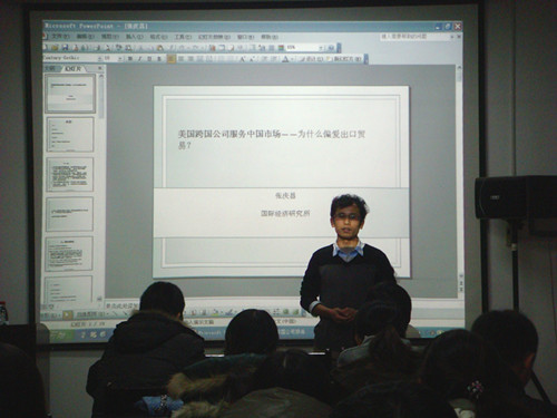 报告会伊始,宫旭红对张庆昌获奖经历及社会阅历等做简单介绍。随后,张庆昌以具体实例结合数字分析引入“美国跨国公司服务中国市场——为什么偏爱出口贸易?”这一问题,并就此展开专题报告,依据自身调查研究对问题进行详细讲解。他将中美两国的跨国公司进行比较,分析两国公司优劣势,通过详细数字计算、公式推导及查找文献,得出美国对中国出口以混合性投资为主一结论。同时,他从基础背景、理论基础、回归模型和数据等方面,归纳跨国公司偏爱出口贸易原因。接着,他结合自己的文章向大家介绍写论文时如何进行问题提出和思路设计,并强调论文写作时参考文献的重要性。报告会最后,张庆昌与我校研究生展开互动交流,他对同学们提出有关国外学习状况、如何发表学术论文等问题均认真解答,并详细介绍申请出国提交offer的步骤。