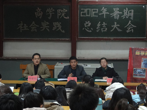 11月22日下午,商学院在一号教学楼东二合堂举行了2012年暑期社会实践总结表彰大会。商学院团委书记郝鹏、副书记韩智利、王婷及10、11级全体团支部书记、12级组织宣传委员参加了此次会议,会议由韩智利主持。