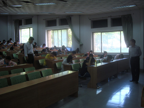 5月11日下午2:30到4:00,商学院第五期党课培训结业考试在东校区3号教学楼108、109、210、310教室举行,学院党委书记段福兴、副书记刘伟、团委书记郝鹏等领导,对党课结业考试进行了巡考。