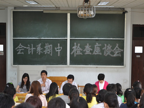 会计系于5月16日下午在3号教学楼303教室举行期中检查座谈会。院团委书记郝鹏,会计系主任赵耀及相关辅导员与部分学生代表参加了此次会议。会议开始,同学们积极提出自己在学习生活中遇到的困惑,现场气氛十分活跃。在谈到考研问题时,赵耀强调:备考研究生要从大一大二开始着手,作为12级新生大一要注重英语数学的学习,打下良好基础,大二要注重原理性知识的学习与掌握,拓宽自己的知识面。大学要进行的自我管理和自我教育。郝鹏就这一问题也提出了自己的建议。同时对于研究生院校选择的问题,赵耀指出,一选城市,二选学校,三选专业。要提早准备,坚持到底,为自己争取一个更高的平台。随后对于同学们生活中遇到的问题,老师们一一进行详细的解答。最后,郝鹏对此次座谈会进行总结,会议在掌声中结束。