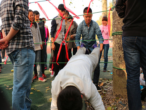 活动伊始,活动负责人将参加人分为8队,由队员推选出队长,各队学员积极思考,迅速设计出了特色鲜明、独具匠心的队名和口号,进行了简短的风采展示。拓展活动由“盲人方阵”、“穿越生死网”、“ 坐地起身”、 “七巧板”四个项目组成。活动开始后,队员们经历了队内充分讨论、制定完善方案、团队分工协作等一系列准备工作。在一片愉悦的氛围中,队员们相互认识了解,团结一致,互相鼓舞,加油呐喊声不绝于耳。活动过程中各队成员奋勇争先、不甘落后,均出色的完成了任务。最后,全体成员进行了各班班委的选举。