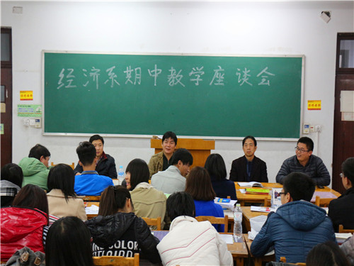 经济系专业于3号教学楼206教室举行期中教学检查学生座谈会。商学院副院长高峰,相关辅导及学生代表参加了此次会议。会议伊始,高峰就本学期同学们的学习及课余生活做简短发言。在接下来的提问环节中,各级学生代表踊跃发言,提出在日常学习生活中遇到的问题,如12级新生普遍关心的大学学习环境方法如何适应、大二同学相关专业课程的学习和大三大四学生关心的考研问题。针对同学们反应的问题,老师们一一做出解答,同时希望同学们学会利用时间,每天给自己制定一个小目标,并在保证学习的基础上,多参加一些课外活动,提高身体素质,实现自己的德智体全面发展,面临毕业的同学们也要摆正心态,把握机会。