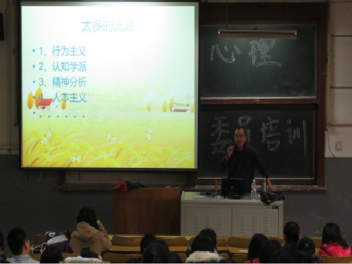 滕亮老师从“心”开始,采用互动参与的方式,通过游戏体验感悟环节,分析了大学生心理健康常见问题及产生原因,向同学们提出了沙盘疗法、音乐疗法、小组治疗等解决办法。会上,滕亮老师不断抛出具有探讨性的问题,现场同学踊跃回答,得到了很好的反响。随后,滕亮对行为主义、认知学派、精神分析,人本主义等流派作出了详尽细致的介绍,普及了心理学的基础知识,心理咨询基本技能和开展心理教育的途径。他指出,每个人的世界都不一样,作为心理委员,应学会善于捕捉他人的心理,学会观察每个同学的心理状况,对身边需要帮助的同学及时伸出援助之手。