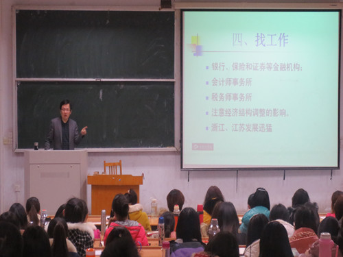 赵耀老师针对大三同学亟待解决的时间规划、个人发展选择等方面问题,结合自身的教学经验,通过展示大量翔实的文字、图片材料和具体实例,帮助同学们全面分析了考研、公考、工作、出国等方面内容,就同学们反映较多的“考研城市、学校、专业的选择技巧”、“会计工作的具体方向”以及“出国的目标设定”等问题提出了合理的应对方法。他鼓励同学们要不忘目标,努力奋斗,争取创造精彩的人生。