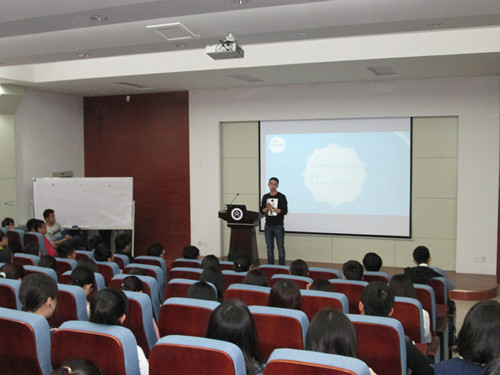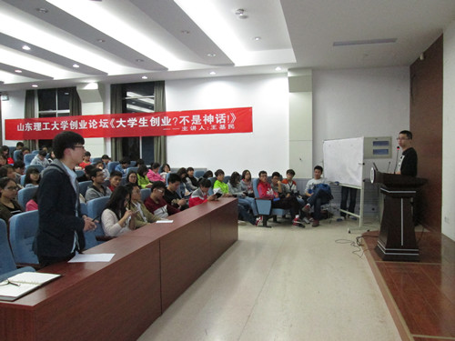 激情点燃梦想,创业成就未来。3月29日晚,由山东理工大学校团委主办,商学院承办的学生创业论坛在四号教学楼报告厅举行,此次论坛主题为“大学生创业不是神话”,杭州赛群网络科技有限公司总经理,我院国贸专业校友王基民担任主讲,部分学生代表参加论坛。