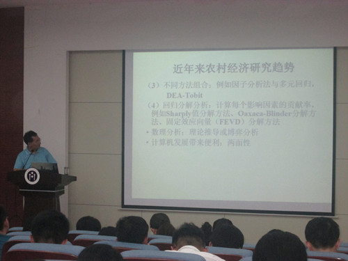 报告会以“学术研究创新与学术论文规范——以农村经济为例”为主题,按“什么是科学研究”“近年来农村经济研究趋势”“学术论文规范”三部分,详细讲解了当下老师和学生热切关注的问题。陈劲松指出,“科学研究应当实事求是,要去粗取精,去伪存真,由表及里,由此及彼。”“科学研究的本质是创新或者发现。”他将近年来农村经济研究的趋势概括为“五化”——规范化,精细化,定量化,国际化,宽泛化。当陈劲松研究员讲到学术论文的规范时,全场氛围达到高潮。他还强调“创新”,提到“学术论文的基础是科学研究,70%的工夫用在研究,30%用在写论文。这是工夫上的划分,而不是时间上的先后,论文应‘水到渠成’”“内容最重要的应是观点新。”等观点。最后,他对学术论文的规范作了小结,用“言之有物”、“言之有理”、“言之有据”、“结构清楚”、“表述准确”、“深入浅出”等词语精确概括。全场报告会,会场座无虚席,陈劲松严谨的风格、精辟的观点,不时赢得阵阵掌声。