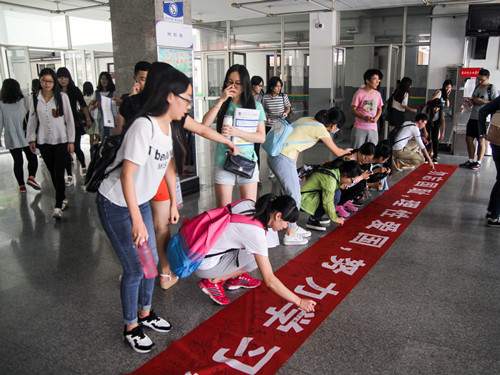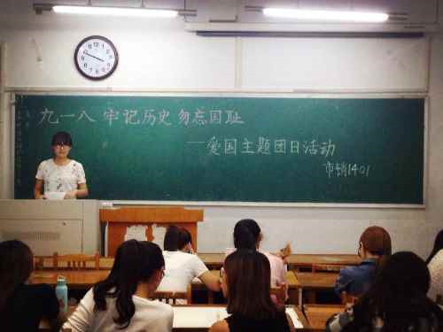 上午10时,学院于三号教学楼大厅举行纪念“九一八”主题签名活动。横幅上黑笔书写“勿忘国耻,理性爱国,努力学习,奋发自强”,这一理念得到了同学们的赞同,同学争先恐后、踊跃签名。此外,会计1402、市销1401、国贸1401、国贸1304等团支部还开展了主题团日活动,通过奏唱爱国主题歌曲、演讲等形式,抒发爱国情怀、坚定理想信念,让同学们广受教育。