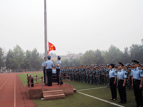 早上,全体大一新生、教官及国防生在操场举行升旗仪式。6点15分,国防生踏着整齐划一的步伐,意气风发,精神饱满,将国旗护送到升旗台。随着雄壮的《义勇军进行曲》响起,鲜红的五星红旗冉冉升起,飘扬在校园上空。在肃穆而凝重的氛围中,同学们庄严肃立,向国旗行注目礼,以自己的方式表达对抗战先烈的缅怀和敬意。