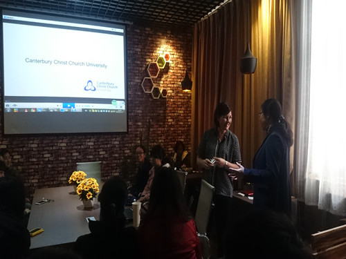 在随后的出国项目宣讲交流上,英国坎特伯雷大学商学院副院长、科林留学教育的胥晓婧老师与同学们围坐一桌,品茗畅聊。Suzaue通过几个小短片描述了英国坎特伯雷大学的地理位置和校园环境。随后,她介绍了学院教学课程和就业形式。接着,胥晓婧向同学们介绍了“2+2”“3+1+1”项目,即两年国内两年国外或者三年国内一年国外一年硕士,毕业后可获得山东理工大学和坎特伯雷大学双学位证书。最后,Suzaue向大家介绍了课程学习方法及学位考核标准。她提到,该校中国留学生较多,有利于学生之间的交流,政府对学校投入比例很大,同学们可以舍弃后顾之忧,放心就读。最后,Suzaue为在座学生分发了小礼物,并与大家合影留念。一下午的交流,气氛愉悦,笑声不断,同学们纷纷感到收获颇多。