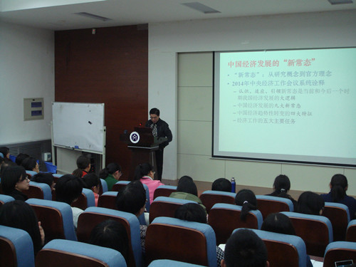 晚上,盛斌于四号楼二楼报告厅举行了学术报告。报告以“中国对外经贸发展的‘新常态’与新战略”为题,从中国经济的平衡发展、协调发展、可持续发展和包容发展四个美好愿景入手,详细展现了盛斌对当代外贸发展研究的最新成果。他提到,经济的发展从注重速度到追求质量是“新常态”的一大特点,对外经贸发展的竞争关系也由各国间单边竞争变为全球角力。随后,他从发展速度、发展模式、地区结构、贸易结构、资本流动、贸易与外资政策、对外贸易与投资协定、国际竞争优势、国际合作方式、贸易争端与摩擦十个方面讲述了中国对外经贸发展的新形势、新背景和新挑战。最后,他提出了“实施新一轮高水皮对外开放”、“构建全方位对外开放新格局”、“培育积极参与和引领国际政治经济合作竞争新优势”三点建议。