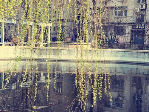 万花丛中一点绿,岸边杨柳,随风舞动。