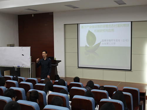 此次报告主要从非烟生态农村建设现状、选择标准、组织模式、运作机制与帮扶措施等多个方面展开讲述。讲座伊始,周涛从“生态村”、“非烟”、“富民帮扶”这几个词的概念入手,运用山东省烟草公司帮扶工作实例,引出培育生态农村富民帮扶机制这一概念。随后,他通过引用沂源桥与博山灌溉阐述了生态村的利弊,而农业生产的组织化、规模化,则通过汇源果汁与农户建设长期合作这一案例进行分析,并得出企业规模经营有利于生产标准化与食品安全性的提高。紧接着,他对这一项目的前期情况进行了简单的介绍,项目汇报内容共包含十个部分,他以非烟生态村组织模式与运作标准、产业价值链构建与运行机制研究与产业生态网络模式研究为重点进行了讲解,最后,针对学生提出的问题,他给出了详细的解答。