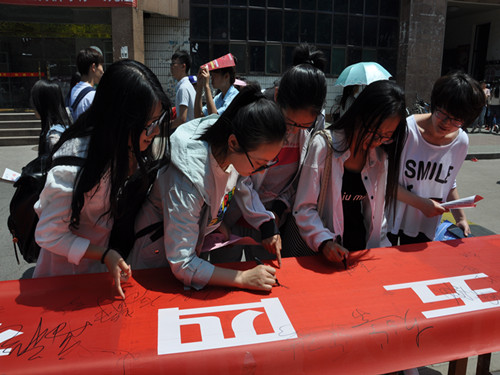 中午,餐厅门口,进行弘扬五四精神的签名活动。从各个方向涌来的同学们纷纷停住脚步,拿起笔,在红色条幅上写下庄严的一笔。学生组织的志愿者们在烈日下,高举五四精神的横幅,积极为同学们服务,展现了五四精神最实际的一面。此次签名活动以“弘扬五四精神”为主题,以一种特殊的方式来警醒青年学生:一言一行皆应传递文明之风,一举一动都要铭记历史使命。
