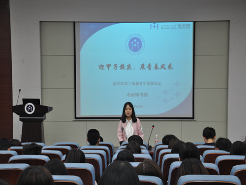 论坛伊始,主持人对新青年发展论坛这一交流活动进行了简单介绍,宣布论坛正式开始。随后,曹蕊分享了她的考研心得,她认为考研道路虽然艰苦,但是选择尤为重要,选择了就要走下去。考研艰苦与高三相似,但是又有区别,考研更多靠的是自制力,并且以上自习带手机为例着重的讲了自制力的重要性,对于选专业与选学校的问题她进行了详细的解答,对于报考专业一定要根据实力报考,对于报考学校,可以对学校分数进行分析,根据规律报考,除此之外,她强调政治要多记忆,数学要注重记笔记。紧接着,崔亚茹针对日常同学咨询她的问题,给出了解答,对于考研时间是不是越长越好,她则认为,并非如此,考研应该有计划,有效率的过某一天,关于报补习班与自学,她则更倾向于自学,并且跟我们分享了一个爱学习的公众号。她还提出了数学卡总分,英语卡单科线的观点,再一次表明了数学与英语的重要性,对于报取高校,她雄心壮志的说,既然选择考了,为什么不选择高一点的学校?为什么不去赌一把,你又不是无路可退,只有爱拼才会赢!最后,王宇晨对专硕与学硕的区别做了分析,并对考研用书做了分析介绍,在坚持这一话题上,她说道,选择自己喜欢的高校,就努力去考,一年不行就俩年,俩年不行就三年,足以看来坚定的语气与成功的背后是数不尽的泪水与汗水。