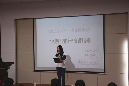 比赛伊始,主持人对比赛的规则和评分标准等作了阐述,从演讲内容、语言表达、形象风度、综合印象四部分做出演讲评分要求,根据参赛选手的演讲情况,评出奖项,优秀者将优先在商学院毕业晚会上被选用。比赛开始之前,校朗读者代表张潇文作开场演说,正式比赛开始,各参赛选手以文明涵养、文明意识、文明传统为视角进行演讲,将文明与民族、道德、自身习惯相联系,向“争做五有大学生,共建美好商院‘文明与我行’”演讲主题靠拢,以背景音乐、ppt作为辅助,选手灵活采用典故、新闻事件、自身经历感受阐述自己的演讲主题,或慷慨激昂,或诙谐幽默,或沉郁悲怆,各显千秋,极尽个人鲜明特点,评委点评简明扼要,给出自己的独到见解,有助于选手积累比赛经验,提高演讲水平。