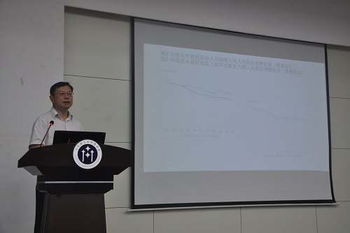 活动伊始,臧旭恒表示,消费对经济增长的促进作用正逐渐增强,根据国家统计局的数据,臧旭恒展示了关于最终消费支出对中国国内生产总值增长的贡献率折线图,生动形象的向同学们展现了最终消费支出对中国GDP增长的贡献比例。然后,臧旭恒向同学们列举了2008年美国次贷危机引发全球性金融危机和经济危机的例子,使同学们了解到中国经济对外依赖程度之高,他强调中国经济进一步增长的模式到了必须转变的一个关节点,需要从主要依赖投资需求拉动和出口需求转动模式向主要依赖国内消费需求拉动模式转变。臧旭恒还表示国内外的研究机构、媒体也均看好中国的消费市场,普遍认为消费升级进展较快,新的消费亮点迅速涌现。但是消费作为“拉动经济增长的三大马车”之一,成为经济增长的真正动力还不足。接着,臧旭恒又向同学们介绍了进出口月度同比变化情况波动和固定资产投资月度同比变化情况表以及中国社会消费品零售总额及变化表,使得同学们对中国经济变动情况有了更深入的了解。