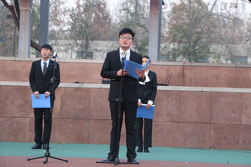 升旗仪式结束后,学生代表黄勇进行国旗下演讲。他讲到,作为青年一代,要贯彻学习十九大精神,深刻体会习近平总书记的讲话,坚定理想信念,志存高远,脚踏实地,为人民利益不懈奋斗,书写更加辉煌的人生篇章。他倡导同学们在今后的工作、学习、生活中,严格要求自我,做有社会责任、有创新精神、有专门知识、有实践能力、有健康身心的“五有”人才。随后,周振带领全体成员宣誓,重温入团誓词。