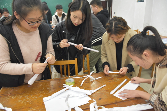 此次比赛分为“财会小常识”、“激情点钞”、“智慧搭桥”三个关卡。第一关“财会小常识”的题目以基础财会知识为主,帮助同学们在活动中更好的了解会计知识,同学们在考场上安静有序地进行试卷答题。第二关是“激情点钞”,每个小组可派出一到两名成员进行比赛,在该环节中学生们清点钞票数量,计算钞票总额,考验学生的点钞速度和计算能力,在实践中强化会计基本能力。第三关“智慧搭桥”,此环节考验团队的集体智慧,小组成员通力合作用纸张、胶带等简易的道具,制作出最好的桥梁,通过在桥梁上放置书本的数量反应桥梁的承受能力。