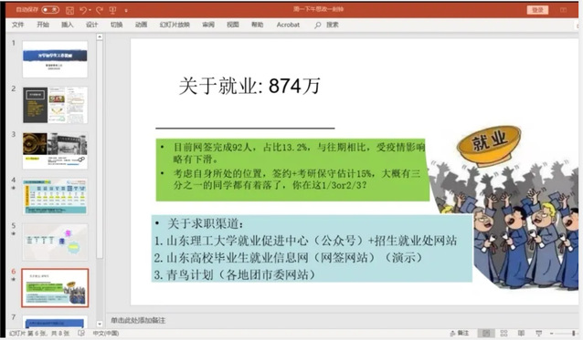 开展一次考研、就业情况指导。针对毕业班考研情况,学院第一时间进行了摸底统计,并将相关数据与各系室进行了对接,各毕业设计指导导师也积极为学生考研复试提供智力支持。目前学院网络签约人数为92人,占比13.2%,受疫情影响,签约率较往年同期有所下滑,辅导员及时跟进,目前已与180余名毕业生开展了一对一网络就业指导。