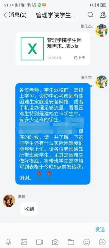 每天开展一次线上教学情况摸底。为保障网络教学工作的顺利开展,辅导员每天关注学生上课情况,并及时与学院教学工作办公室沟通,通过教学联动,保障网络教学质量提升。同时针对网络平台使用较多、网络流量问题、网络不佳等特殊情况学生,及时跟进,帮助学生解决实际困难。