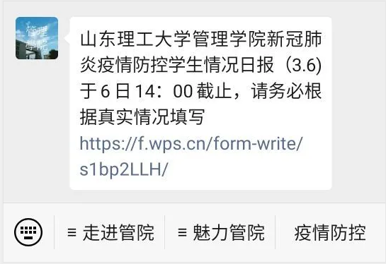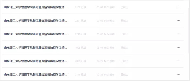 学院自2月8日启动15名湖北籍学生,外加一名滞留湖北学生的安全日报,2月12日启动全院2563名本科生和94名研究生的班级日报。为获得更加细化、精确的数据,学院采取“一竿子插到底”的调查方式,25日利用学院官微启动问卷调研,对全院2657名学生进行每日问卷跟踪,确保信息准确,守牢防控工作第一道防线。同时针对学生的意见和建议,每日利用后台进行逐条回复。