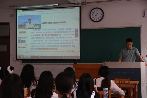 课程伊始,胡兴禹详细讲解我国的疫情防控政策,并通过中西方疫情防控政策的对比,讲述了中国特色社会主义制度的显著优势,他表示,我国始终把人民群众的生命安全和身体健康放在第一位,人民至上,生命至上。在党中央的领导下,全国上下众志成城,守望相助,向世界展现了中国价值、中国精神、中国效率、中国制度。紧接着,胡兴禹讲到,自疫情发生,我校采取了全面防控措施,包括成立疫情防控小组、健全联防联控机制、健全入校人员体温测量和登记制度等,构筑了坚固的疫情防控防线。胡兴禹强调,全校师生要坚定不移地贯彻国家政策,严格落实校园疫情防控新要求,保证学校新学期各项工作有序开展,在做好教育教学工作的同时以高度自觉和责任担当为常态化精准化疫情防控做贡献。