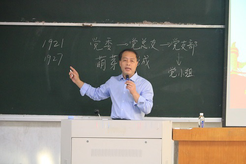 开班典礼结束后,陈俊德为在座入党积极分子讲解专题一“ 党的光辉历程”,带领学生一同回顾党的历史,通过历史事件讲述党的优良传统、优良作风及先进思想。他通过分析重庆谈判、淮海战役等时间节点引出党的先进性,从而体现了党组织坚定理想信念,脚踏实地奋斗的党性。