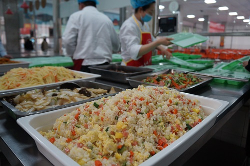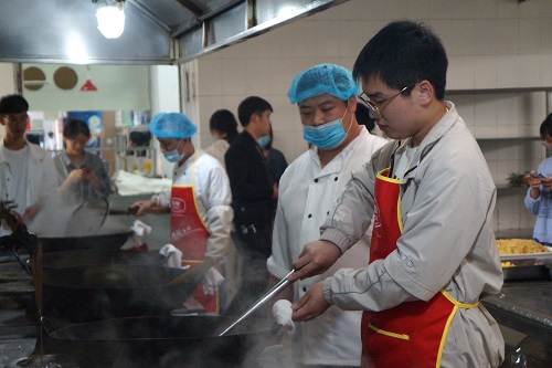学生代表按照制定的计划分为两组,一组为食材准备组,负责食材的清洗和处理工作;另一组为烹饪加工组,在餐厅大师傅的指导下烹饪饭菜。食材准备组成员分类清洗食材,虽大部分学生缺乏实操经验,但在经验丰富的厨师们的指导下,迅速掌握要领,得到了餐厅后厨师傅的好评。食材准备完毕后,烹饪加工组成员点火上油,开始烹饪。由于餐厅锅铲等厨具体积较大,学生一时间无法适应,但在餐厅厨师的指导帮助下,圆满完成了此次意义特殊的烹饪。