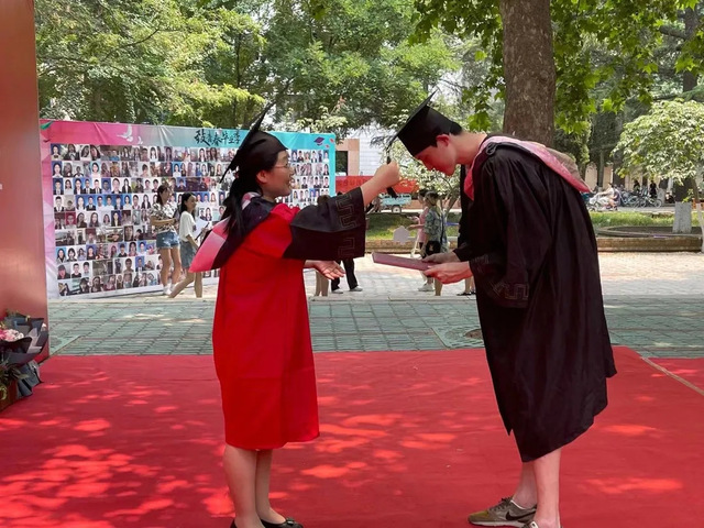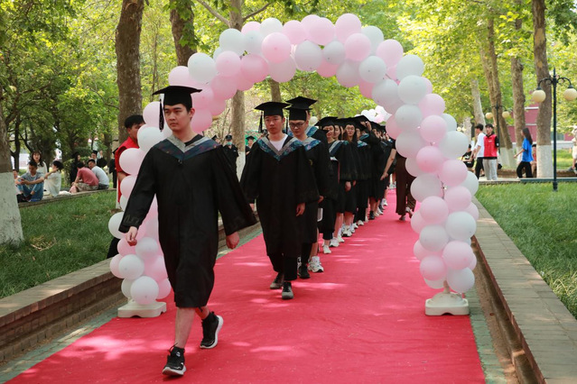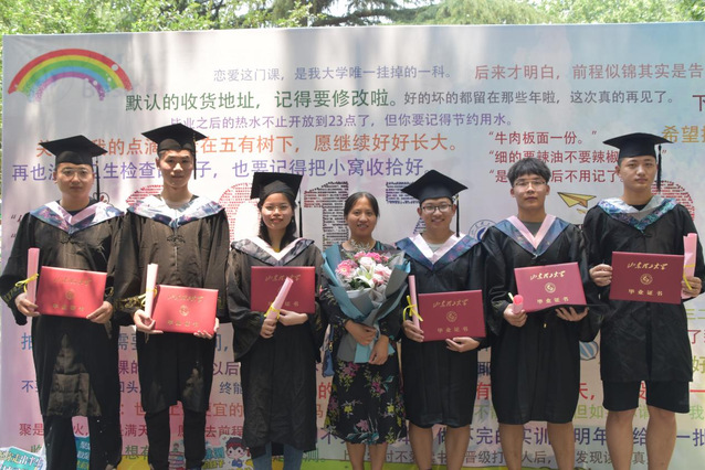 随后,获得毕业资格的2021届毕业生昂首阔步地走过气球拱门,孙秀梅、陈俊德、高静静、蒋兵、白福萍为其正冠拨穗、颁发毕业证书。接着,毕业生们领取学院精心准备的毕业礼物,并与四年来时刻陪伴左右的老师、挚友在“致青春,毕业季”照片墙、标语墙前合影留念。照片墙上熟悉的同窗面孔,标语墙上动人的温馨话语,纪念着毕业生在母校美好真挚的时光。学院为毕业生定制了印有“五有树”的帆布背包及刻有“时光稷忆”的优盘。希望毕业生能够时刻牢记“五有”精神,怀揣着“恰同学少年,风华正茂”的青春热情,带着“五有”人才的奋斗目标,坚韧、沉着、正直、勇敢地踏上新的征程。