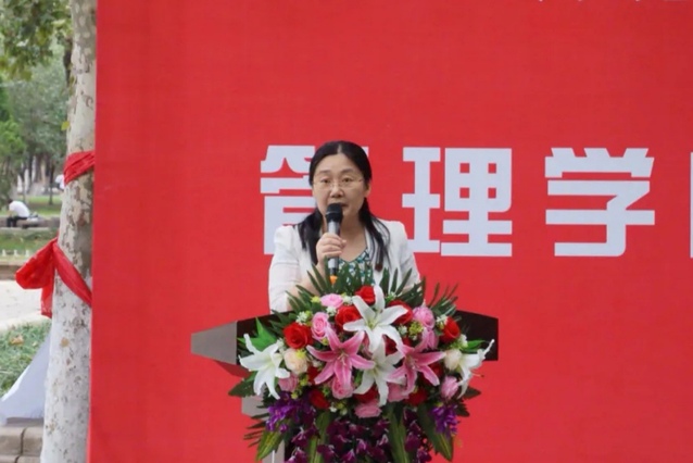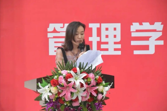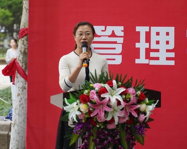 献花结束后,赵艳作为班级导师代表发言,她向新生介绍了班级导师的职责与作用,并解释班级导师与中学班主任的异同。她提到,学习是学生的第一要务。为此,她提出三点建议,一是以方向为前提,将思维从“要我学”转变为“我要学”,做好切实可行的学业规划;二是以勤奋为基础,争分夺秒,努力奋斗;三是以态度为保证,从态度上重视学习,从方法上尊重规律学习,从时间上持续学习。