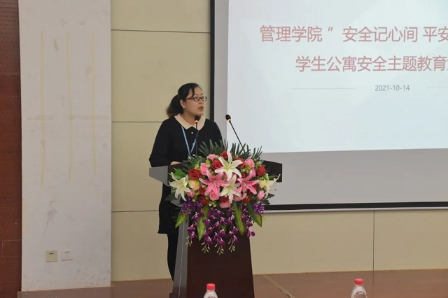 10月14日下午,管理学院在4号教学楼报告厅举行“安全记心间 平安永相伴”学生公寓安全主题教育活动。参加此次活动的有管理学院学工办主任巩丽,各公寓楼楼管员老师,她们分别是4号楼刁倩倩、8号楼于文、9号楼马超群、10号楼陈晓聪,辅导员马传金、郑坤、曹立茹,以及2021级各舍长和学生代表。