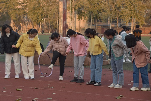接着进行飞圈竞速比赛,比赛形式为班级对抗赛,由各班除“8”字跳绳以外的所有学生组队参加,所有参赛人员手拉手一字排开,工作人员清点人数,随着哨声的响起,参赛成员们全神贯注、不遗余力,第一位成员利用肢体动作将呼啦圈套过身体并传递给下一位成员,第二位成员以此类推,直至最后一名成员完成,计时结束。飞圈竞速比赛拉近了参赛成员间的距离,即使在冬日,成员们仍倍感温暖。