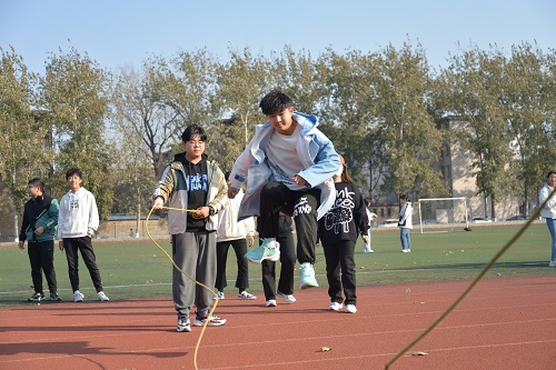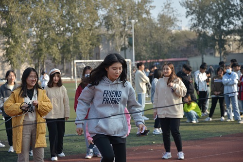 活动分为“8”字跳绳比赛和飞圈竞速比赛两部分。首先举办的是“8”字跳绳比赛,比赛以班级为单位,每支队伍12人,2人负责摇绳,10人参与跳绳,限时一分钟。参赛成员进行赛前简单热身后正式开始,伴随着绳子打在地上均匀有力的声音,10名参赛成员一个接一个地冲进绳圈,完成一轮跳绳后按照“8”字排队继续进行跳绳直至一分钟计时结束。焦灼的赛况激起了参赛成员心中的胜负欲,场边同学纷纷呐喊加油,比赛氛围良好。绳子间来回穿梭的矫捷身姿,展示了学院学生同心协契、拼搏进取的精神面貌。