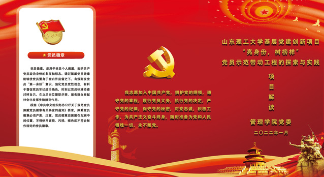 据悉,山东理工大学基层党建创新项目全校共评选确定14项。管理学院党委根据立项要求,初步规划2022年“三亮三树”系列活动10项,并印制《“亮身份、树榜样”党员示范带动工程的探索与实践项目解读》宣传册进行发放。解读手册中详细阐述了项目思路、“三亮”和“三树”工程开展内容、活动安排等,对于怎样“亮”、如何“树”为全体师生党员提供答案。