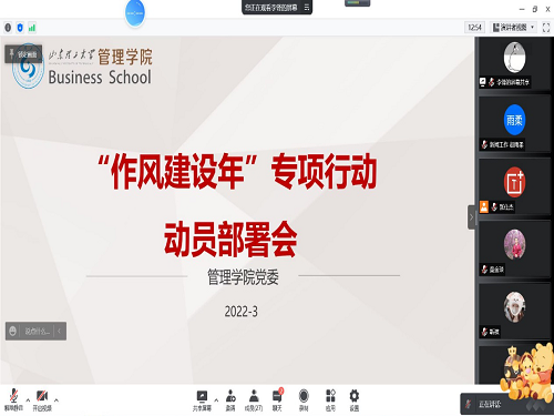 3月18日晚,管理学院党委召开“作风建设年”专项行动动员部署会,此次会议采用线上线下相结合的方式,由学院党委副书记高静静主持,学院党委领导班子、各系室主任及党支部书记参加。