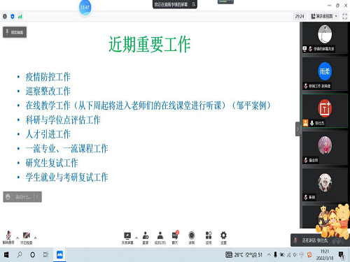 会上,孙秀梅首先在线教学工作上,孙秀梅指出此次安排注重进一步提升教学质量,并通过邹平线上教学师德师风负面案例的讲解,开展师德师风警示教育,要求学院领导及系主任进入在线课堂进行监督听课,并对巡察整改工作的落实相关内容做了进一步的要求和强调。然后,孙秀梅着重强调在科研与学位点评估工作上,要重视工商管理学位点的合格评估工作,在一流专业、一流课程工作上,她讲到要将一流专业评审提上日程,工商、工业专业要注重发展方向,同时推动一流课程的申报。再是在人才引进工作上,孙秀梅提醒老师及各方面负责人要重视方针的转变,注重人才质量的提升。而后,孙秀梅强调2022年复试要尽快谋划落实,克服困难,积极支持复试工作的进行,同时提出希望各系加强对本校学生就业与考研复试指导帮扶工作。