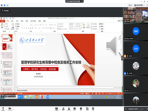 5月2日晚,管理学院在线上召开期中检查部署会。此次会议由管理学院院长孙秀梅、副院长李忠华、副院长胡付领主讲,全体教职工参加。