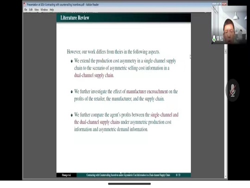 2022年5月5日下午15:00,管理学院邀请华南农业大学经济管理学院副院长黄松教授做线上学术报告。学术报告在4号教学楼学院报告厅举办,报告主题是“Contracting with countervailing incentives under asymmetric cost information in a dual-channel supply chain”。本次学术报告由管理学院副院长白福萍主持,必威登陆页 部分教师及研究生参加。