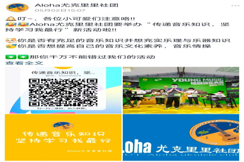 Aloha尤克里里社团于5月8日-14日线上举办“传递音乐知识,坚持学习我最行”活动。有位教育家曾说过“没有艺术的教育是个不完整的教育”。音乐是艺术最好的体现。设想没有音乐,我们就得不到全面的发展,我们的生活就会缺少美感节奏感,生活会变得枯燥无味。我们聆听音乐,鉴赏音乐,生活因为有音乐而变得如此美好!