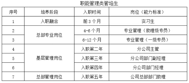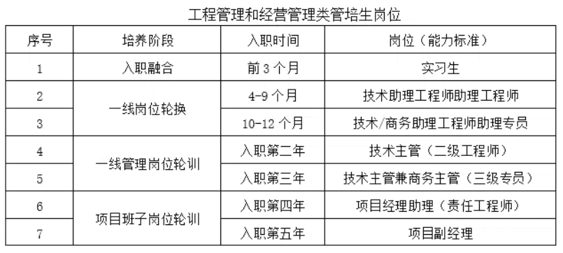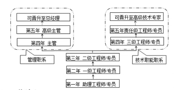 公司建立了完整系统的培训体系,应届毕业生入职以后,先按照技术职能职系的标准进行考核和晋升,入职满三年,根据个人职业发展意愿和工作岗位需求,员工可选择走管理职系或技术职能职系发展道路,从而将个人的职业发展与公司的发展需求紧密结合起来,实现自我的人生价值。