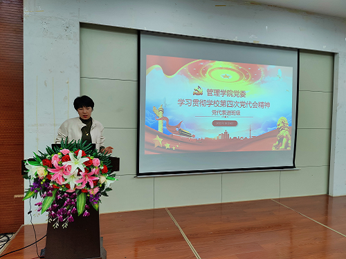 为深入学习宣传贯彻学校第四次党代会精神,管理学院党委积极周密部署,迅速制定了工作实施方案,开展多层次多形式的理论学习和研讨宣讲活动,努力把各支部、党员干部和师生员工的思想和行动统一到党代会精神上来,把智慧和力量汇聚到落实学校党代会确定的各项任务上来,掀起了学习宣传贯彻党代会精神的热潮。