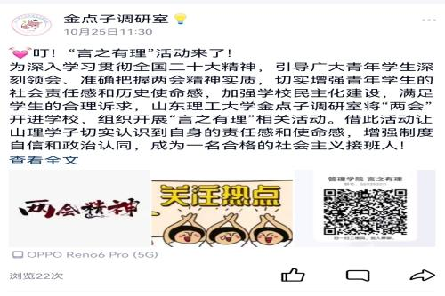 为深入学习贯彻二十大精神,引导广大青年学生深刻领会、准确把握两会精神实质,加强学校民主化建设,满足学生的合理诉求,10月28日到11月3日,金点子调研室社团组织开展言之有理比赛,管理学院学生踊跃报名,积极参加此次活动。