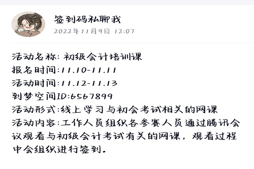 11月12日,负责人员在群里发布腾讯会议二维码,并请大家准时进入会议。大家进入会议后,负责人员播放准备好的会计培训课程。课程是关于经济法基础的相关考点,老师在课程中先简略介绍考试科目、考试大纲、考试形式、考试时长、考试时间,并根据各个时间段,给出备考的方式与参考文献和题库。之后,老师开始就初会中经济法基础的相关考点,比如法律责任、自然人的民事行为能力、能否抵扣进项税额等内容进行阐述。同时,老师结合往年真题,进行知识点讲解,细致入微,通俗易懂,对初会考试有关键性帮助。