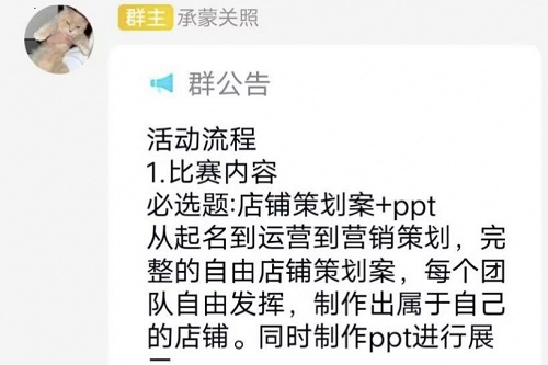 首先,参赛人员进入活动群聊,活动负责人在群内发布在线表格。参赛人员进行1-3人的自由组队并填写表格,自选一个自己喜欢的行业,从店铺命名到运营规划等自主创立一个店铺,撰写策划案并准备答辩PPT。随后,活动正式开始,策划案和PPT于12日前发送至社团官方邮箱,评委根据策划案和PPT的具体内容、逻辑、创新等方面做出评分,并根据成绩分别排出一二三等奖,随后在活动群中发布获奖名单。每支小队的店铺选择各有不同,每个队伍的想法都十分精彩且富有创意。最后,庄新福宣布比赛结束。