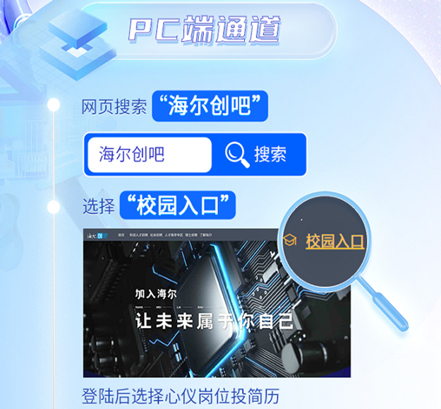 网页搜索“海尔创吧”(进入海尔官方招聘网网站),选择“校园入口”,登陆后选择心仪岗位投简历。