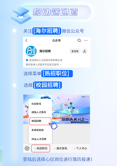 关注【海尔招聘】微信公众号,选择左下角菜单【热招职位】,选择【校园招聘】,登陆后选择心仪岗位进行简历投递