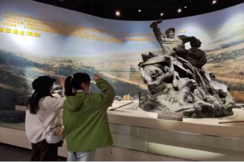 来到博物馆深处,便是抗日战争阶段历史文化展览。在那个日寇铁骑乱踩乱踏的时代里,这座城市中有着许多先人为守护华夏大地,将热血洒在这片土地上。在抗战军民雕像处,志愿者们了解到面对日寇的“三光”政策,全民皆兵,杀鬼子保家乡;妇女成立妇救会,纺线织布做军鞋;青壮年踊跃参军,参与兵工厂制造,先生产子弹、土枪、手榴弹等简易武器,后生产手雷、地雷、石雷等杀伤力较强的武器,支援抗日军民英勇杀敌,直到抗战胜利。听及此,志愿者们不约而同向这座雕像行军礼以示心中敬意。