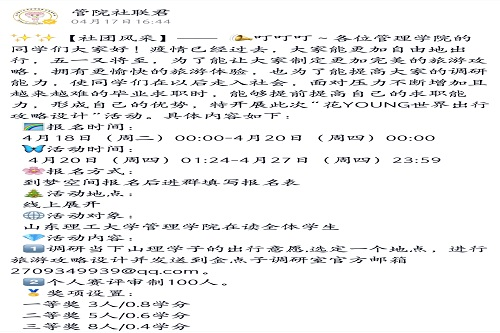 此次活动由金点子调研室于线上举办,报名时间为4月18日至4月20日,活动时间为4月20日至4月28日。此次活动在举办前经过了管理学院多彩活力学生社团的宣传,吸引大量的同学积极踊跃地参与此次比赛。
